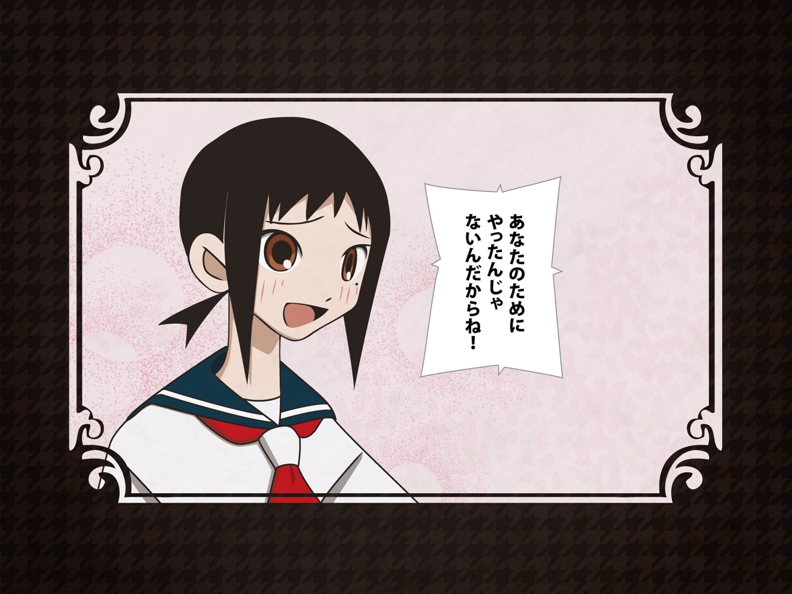 Description: A girl with a red tie and a white shirt and a black and pink background with a white paper.
