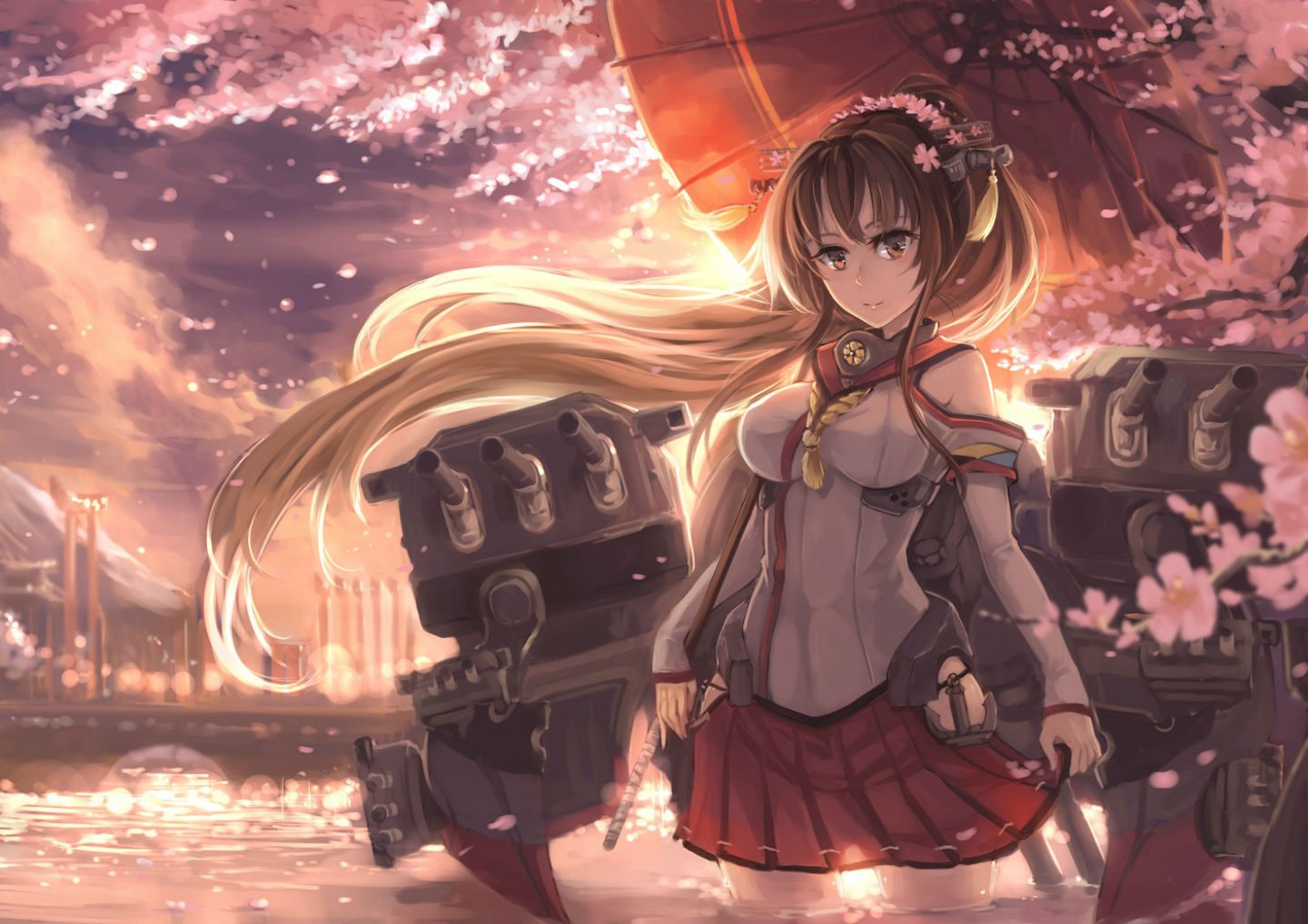 Description: A girl with long hair and a red umbrella walking in the rain with pink flowers in her hair and a pink umbrella.
