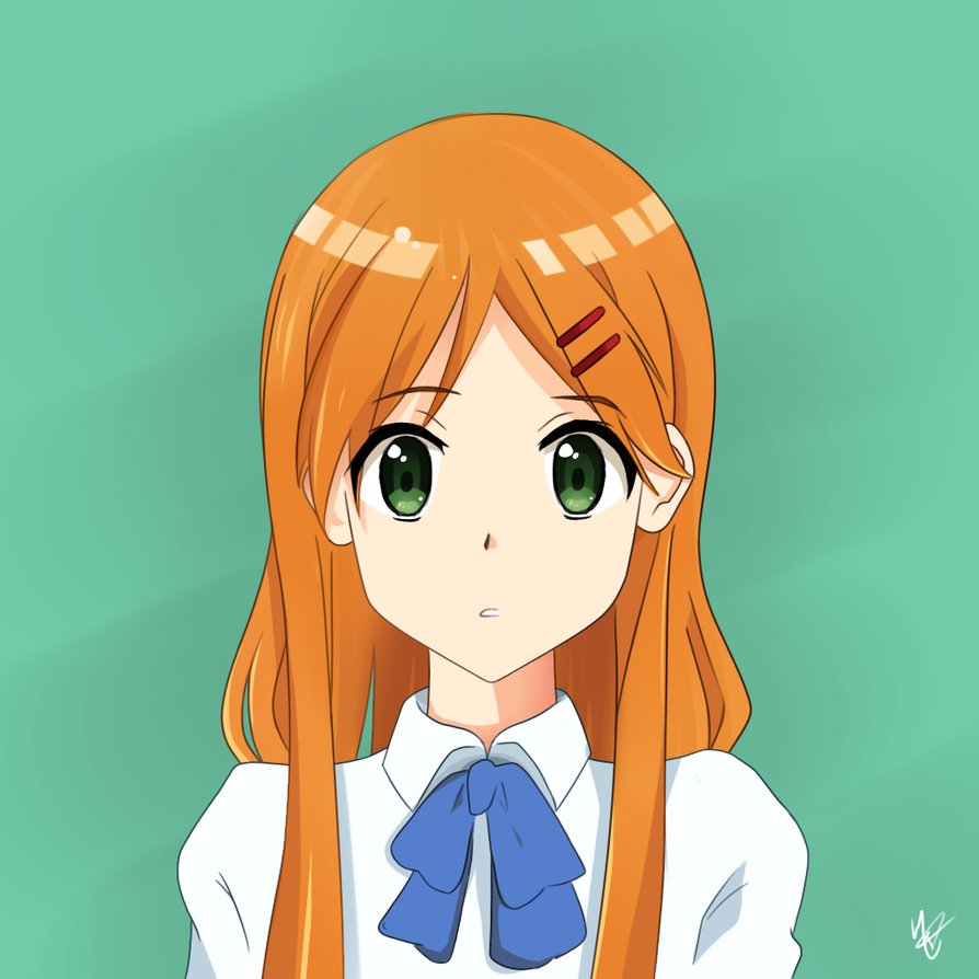 Description: A girl with long red hair and green eyes wearing a white shirt and blue bow tie.