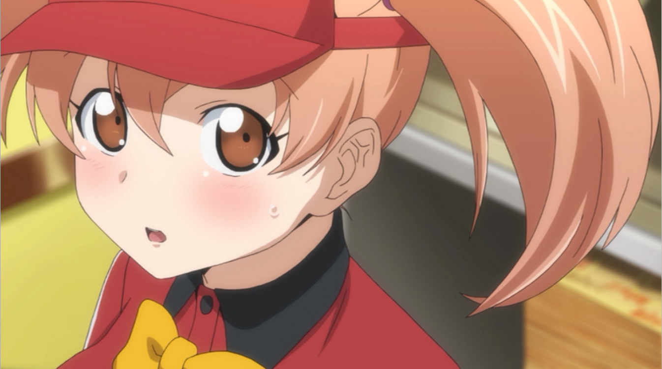 Description: A girl with a red hat and a red shirt and a yellow cat in her hand and a red cap on her head.