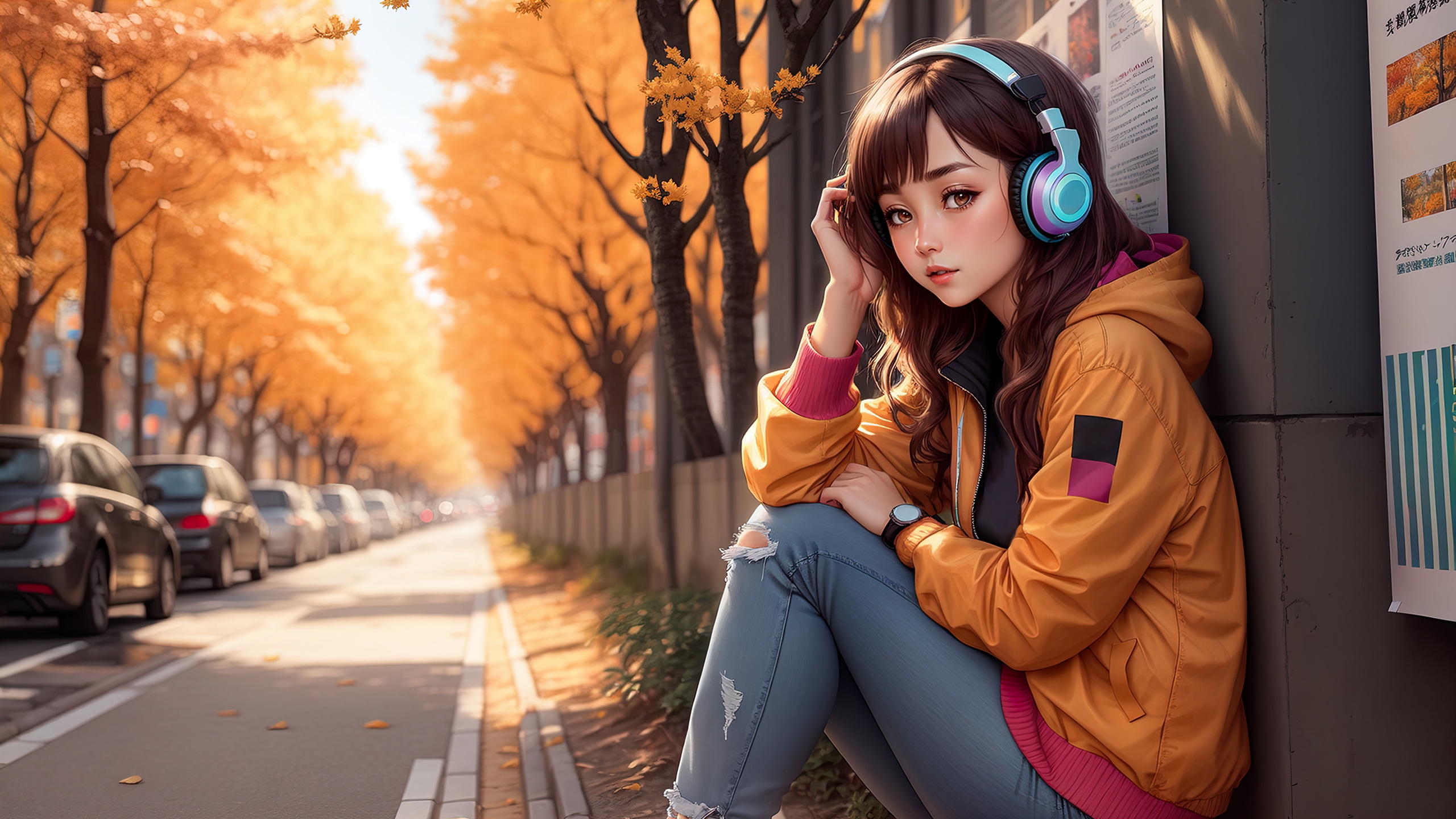 Description: A girl sitting on the side of a road with headphones on her ears and leaning against a wall.