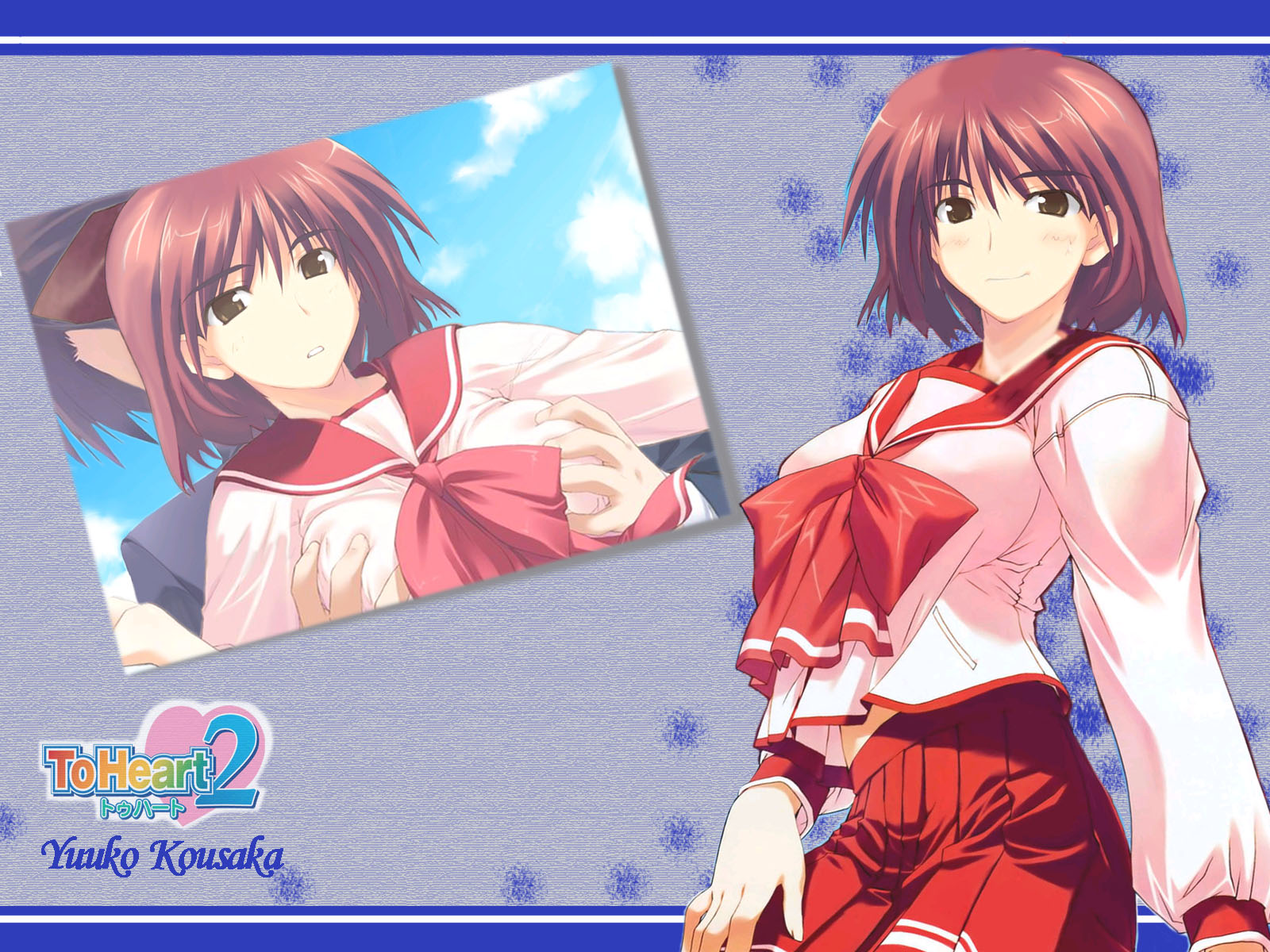 Description: A girl in a sailor outfit with a bow around her neck and a picture of a girl in a sailor outfit.