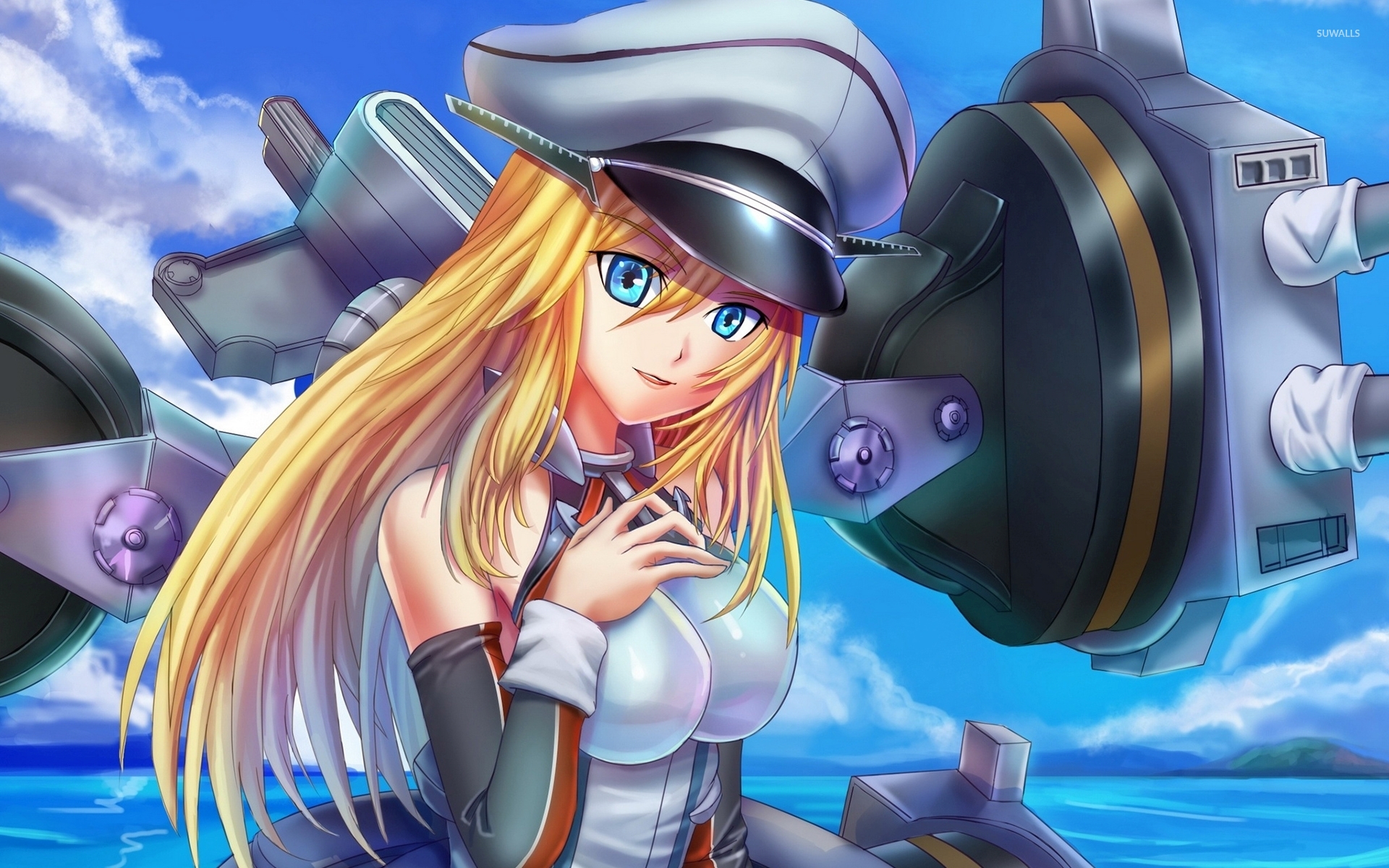 Description: A girl in a sailor outfit standing in front of a machine gun and a ship in the background with clouds.