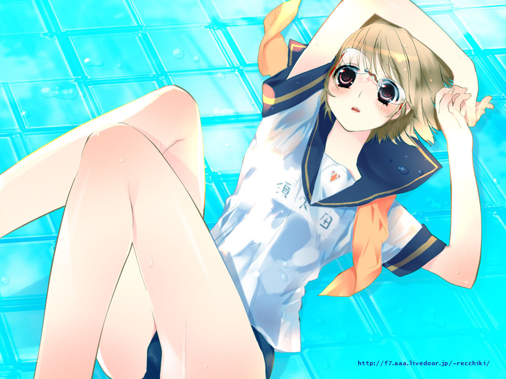 Description: A girl in a sailor outfit floating in a pool of water with her legs up and her legs up.