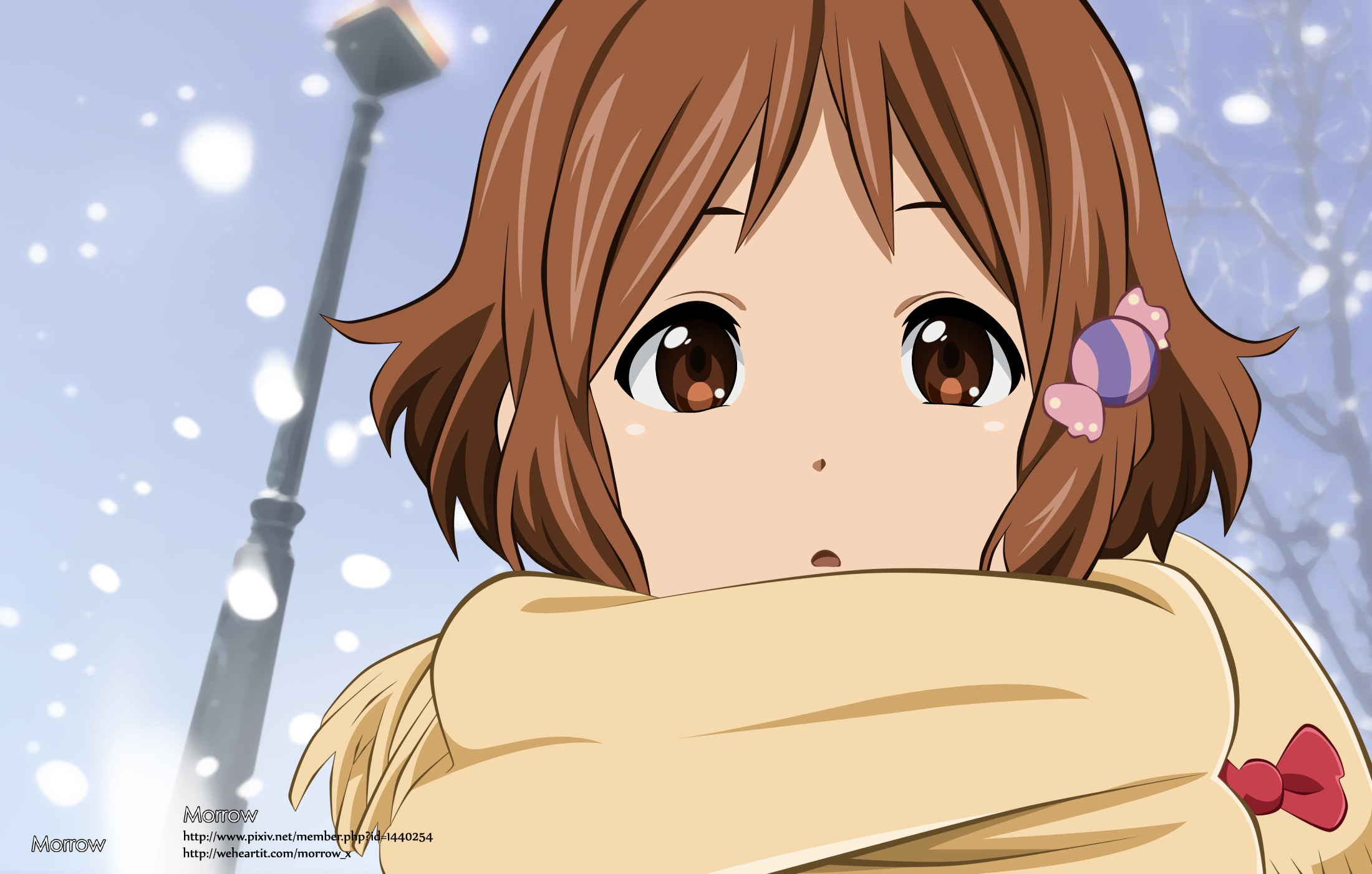 Description: A girl with a scarf around her neck and a street light in the background with snow falling on her.