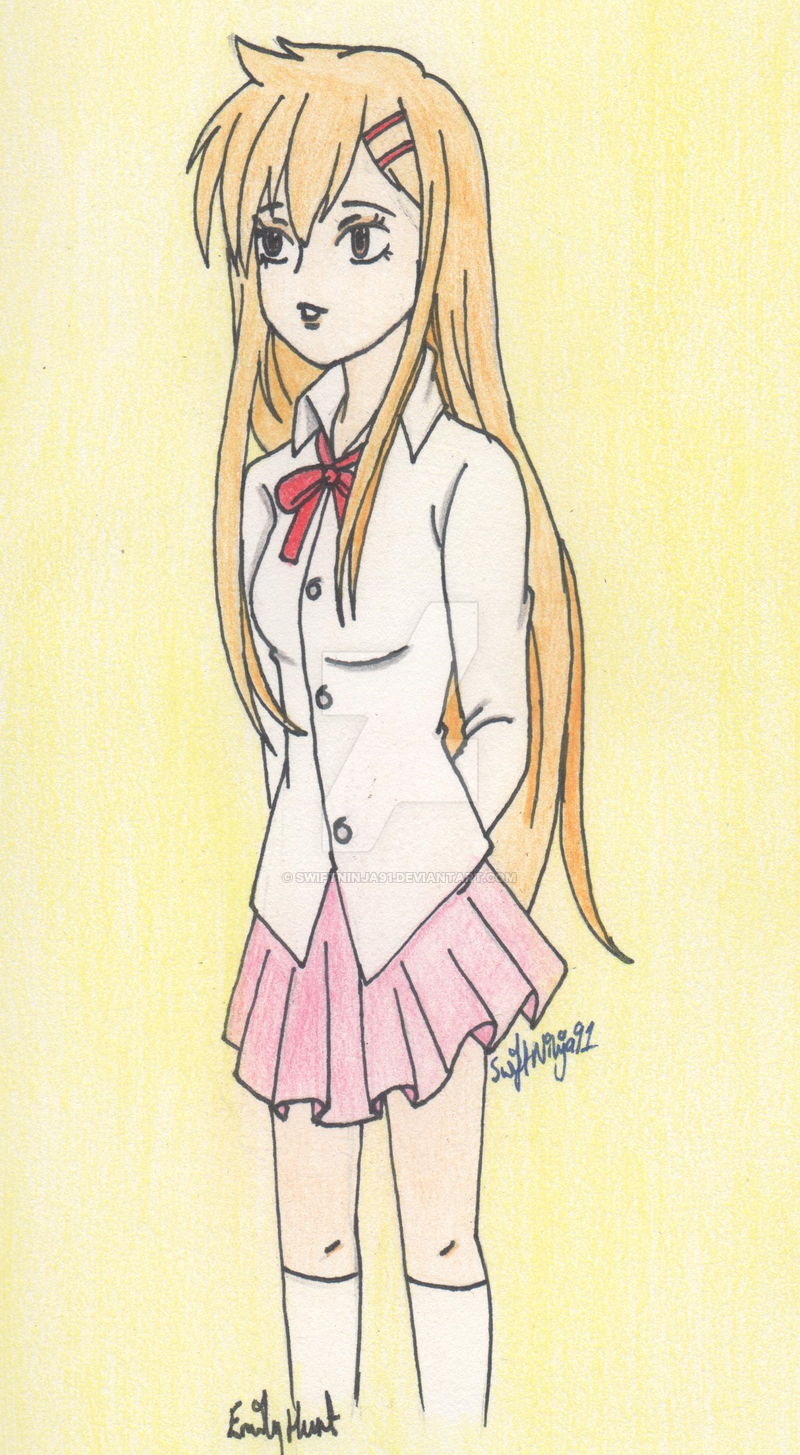 Description: A drawing of a girl in a school uniform with a bow tie and a skirt on her knees.