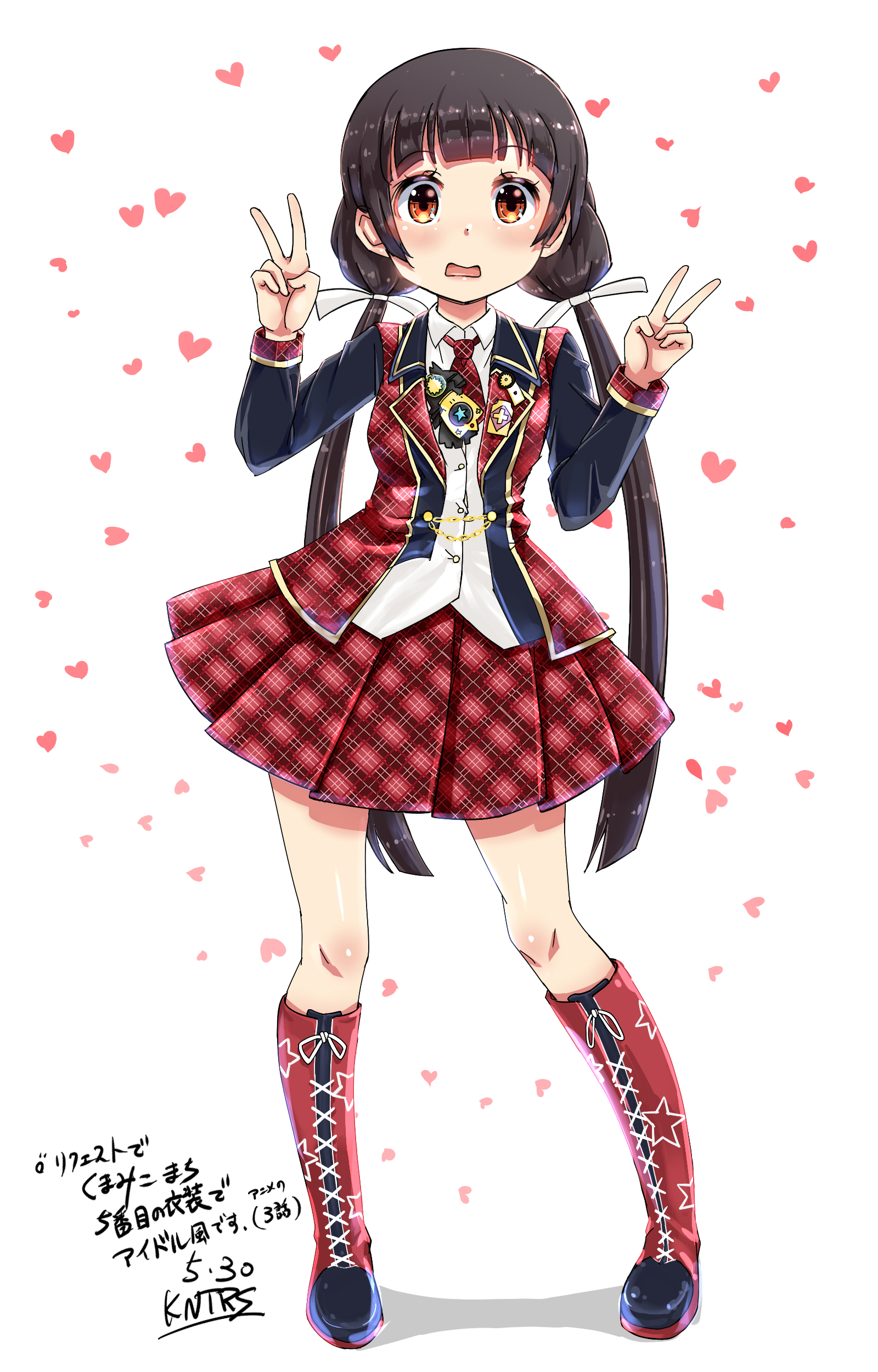Description: A girl in a school uniform with a peace sign in her hand and hearts in the background.