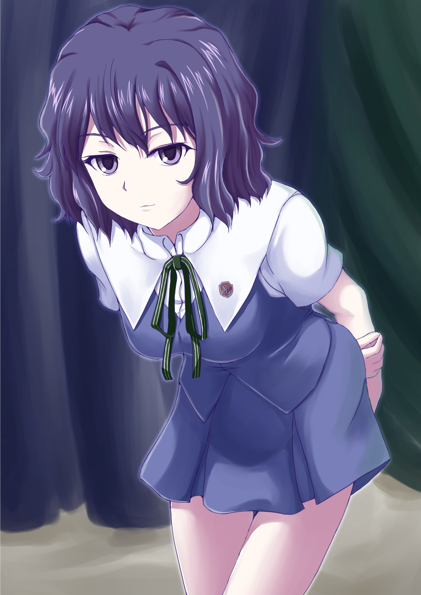 Description: A girl in a school uniform is posing for a picture with her hands on her hips and her legs crossed.
