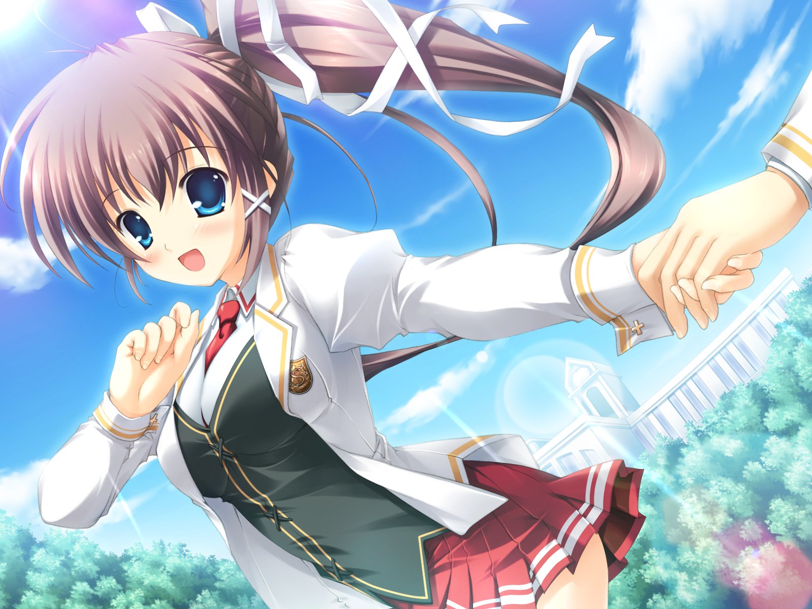 Description: A girl in a school uniform is holding a sword in her hand and a sky background is in the background.
