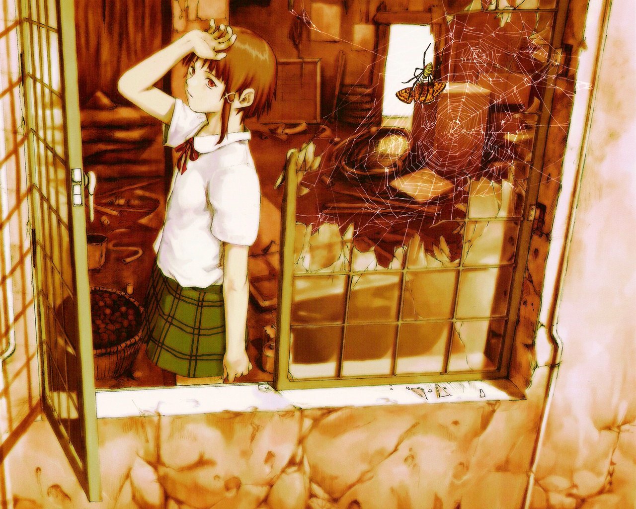 Description: A girl in a school uniform is looking out a window at a spider web in the background and a spider web in the foreground.
