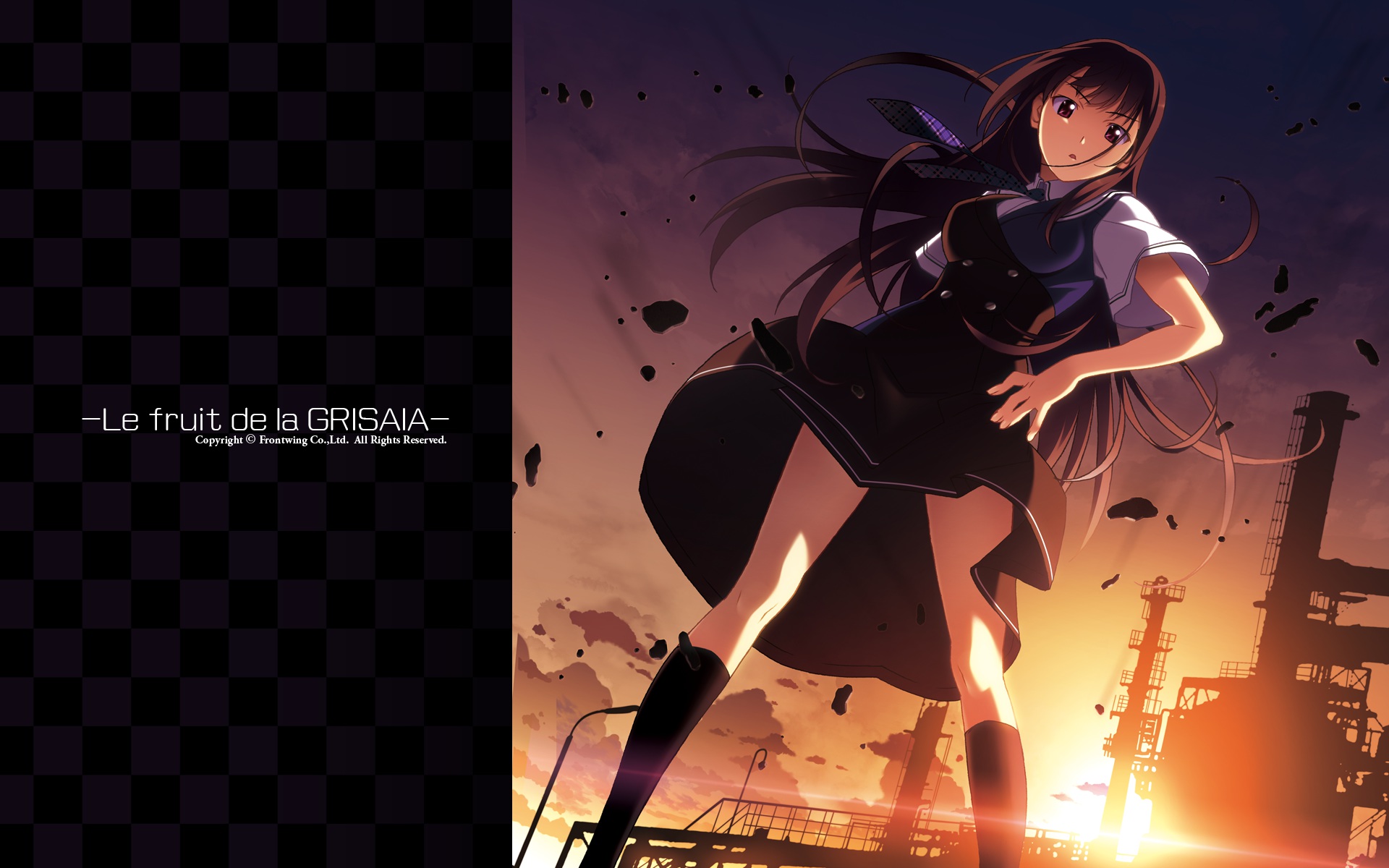 Description: A girl in a short dress standing in front of a factory with a gun in her hand and a background of a sunset.