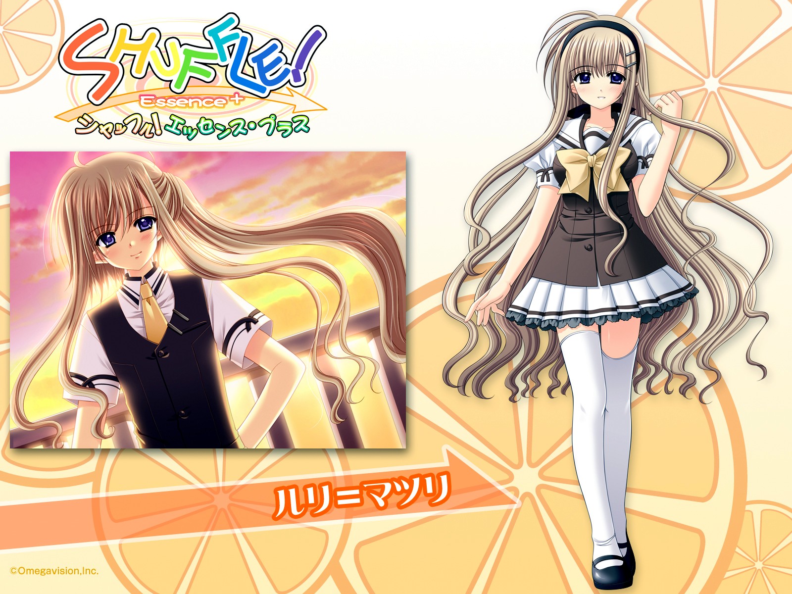 Description: A girl in a short dress and a short skirt with long hair and a lemon slice background with a picture of a girl in a short dress.