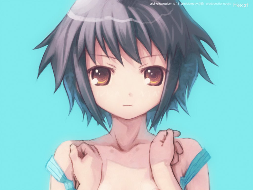 Description: A girl with very big breast and very short hair is posing for a picture with her shirt open and her eyes closed.