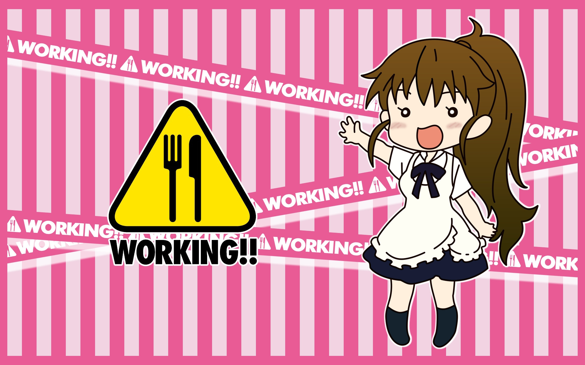 Description: A girl is standing in front of a sign that says working is wrong and a fork and knife is in the background.