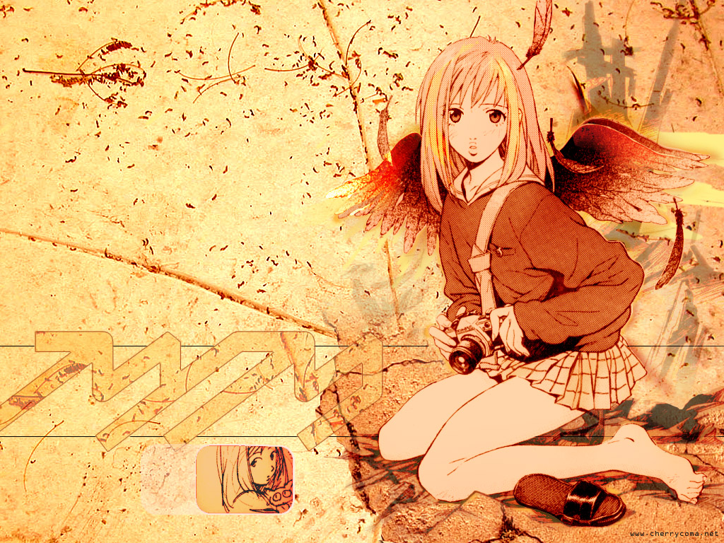Description: A girl with a sword sitting on the ground with a bird flying above her head and a bird flying above her head.