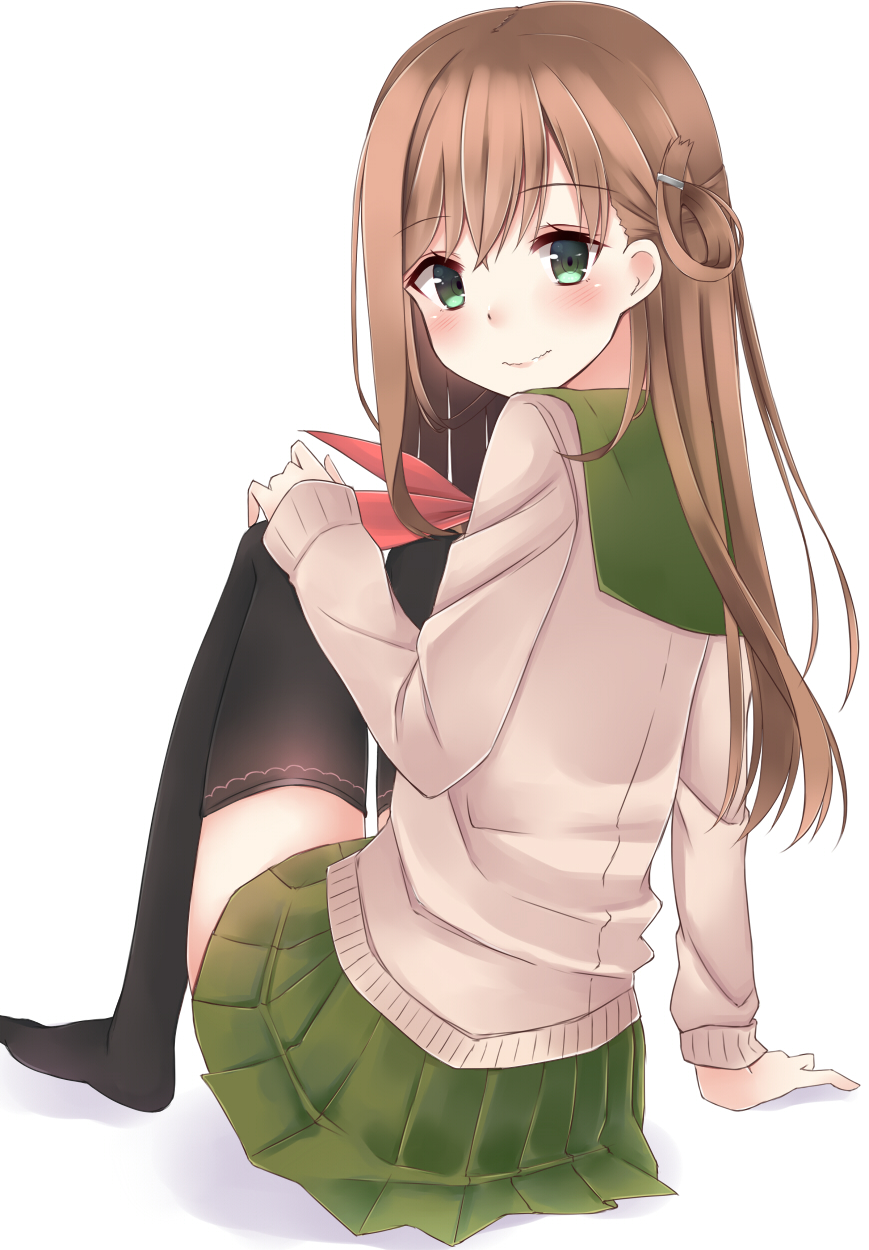 Description: A girl sitting on the ground with a bow tie on her neck and a green skirt on her knees.