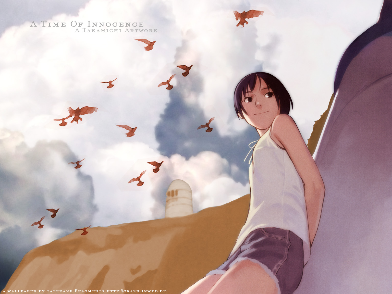 Description: A girl is sitting on a ledge with birds flying overhead in the sky above her and a lighthouse in the background.