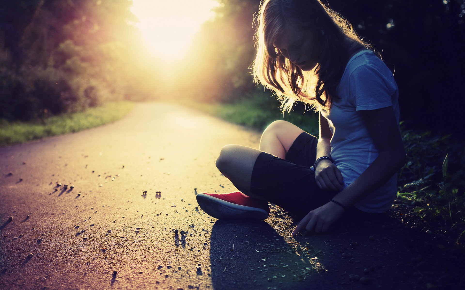 Description: A girl sitting on the side of a road with her shoes on the ground and the sun shining through the trees.