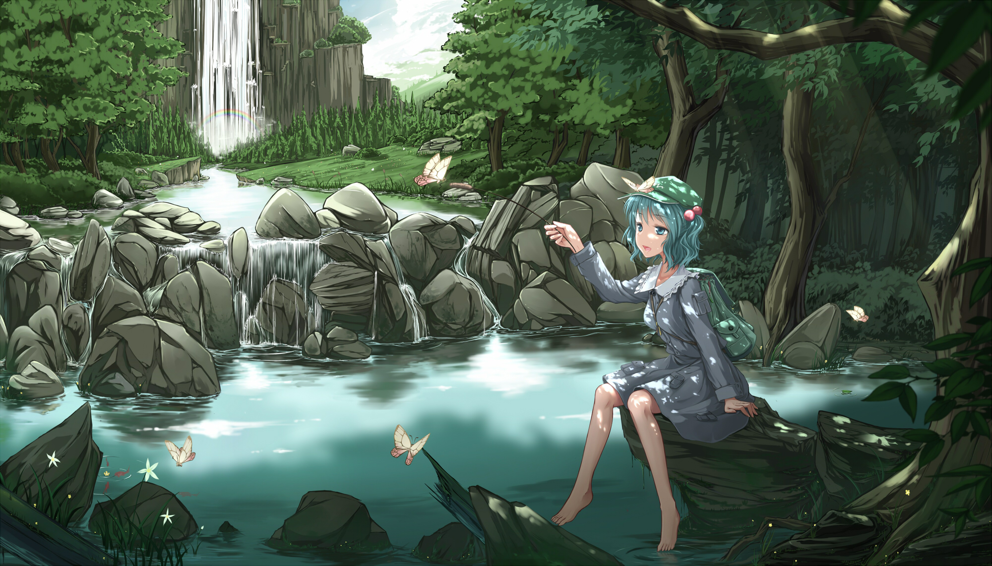 Description: A girl sitting on a rock in a forest next to a waterfall and a waterfall falls behind her.