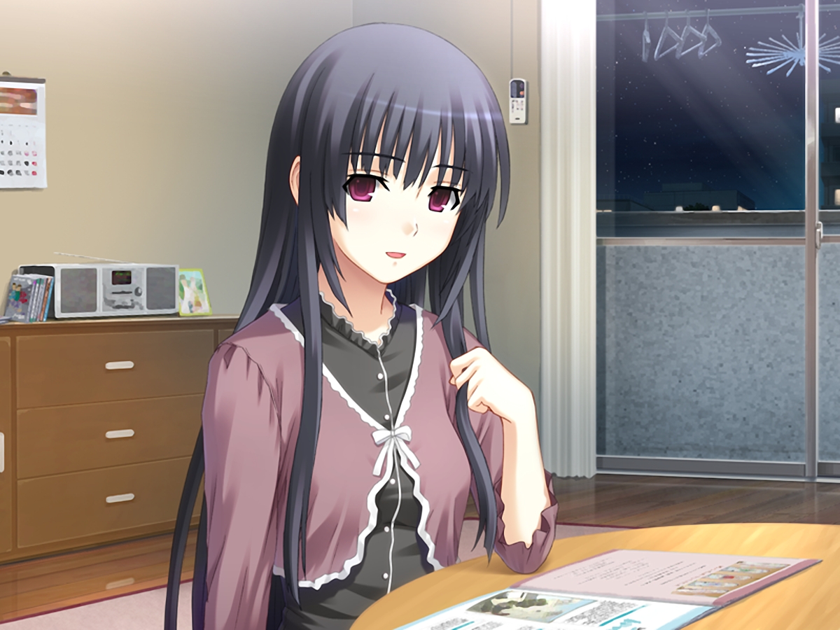 Description: A girl sitting at a table with a magazine in front of her and a book in front of her.