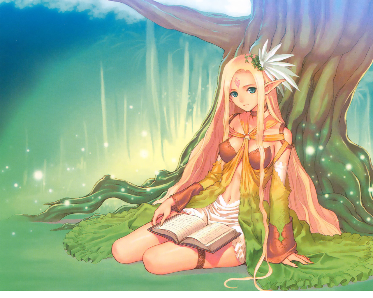Description: A girl sitting under a tree reading a book in the grass with a tree in the background and a sky in the background.
