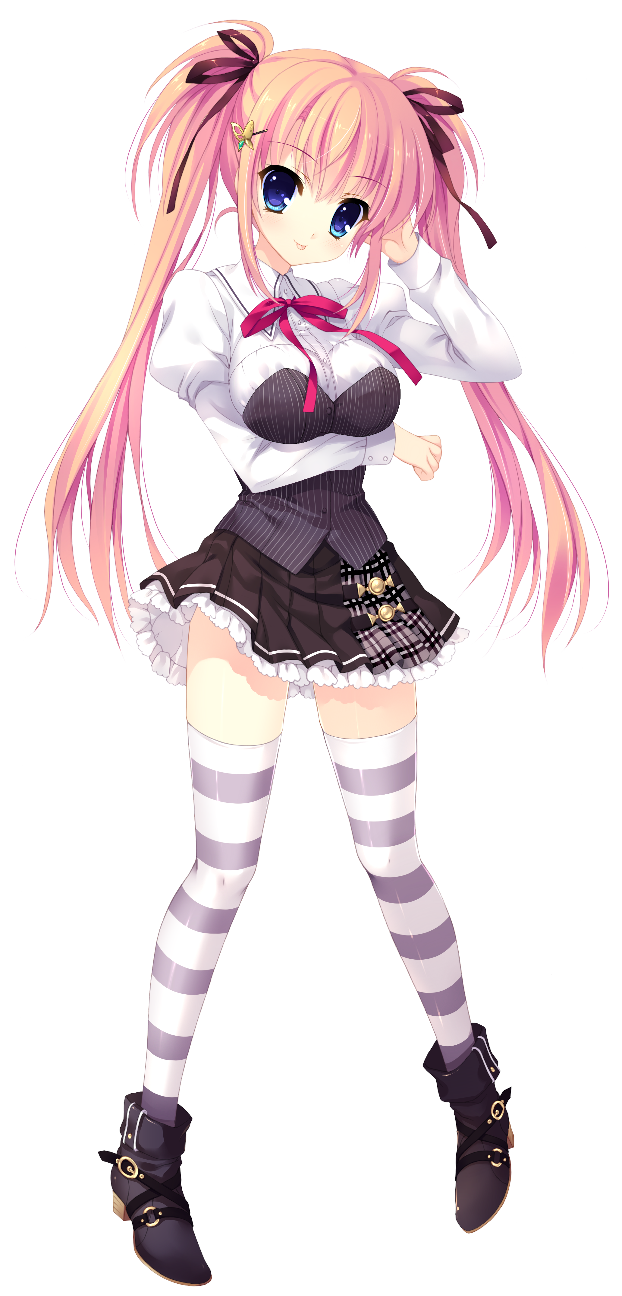 Description: A girl in a skirt and boots with a bow tie on her head and a white shirt with a black and white striped skirt.