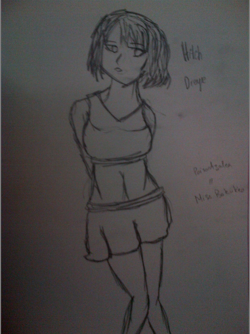 Description: A drawing of a girl in a skirt and top with a name written on it.