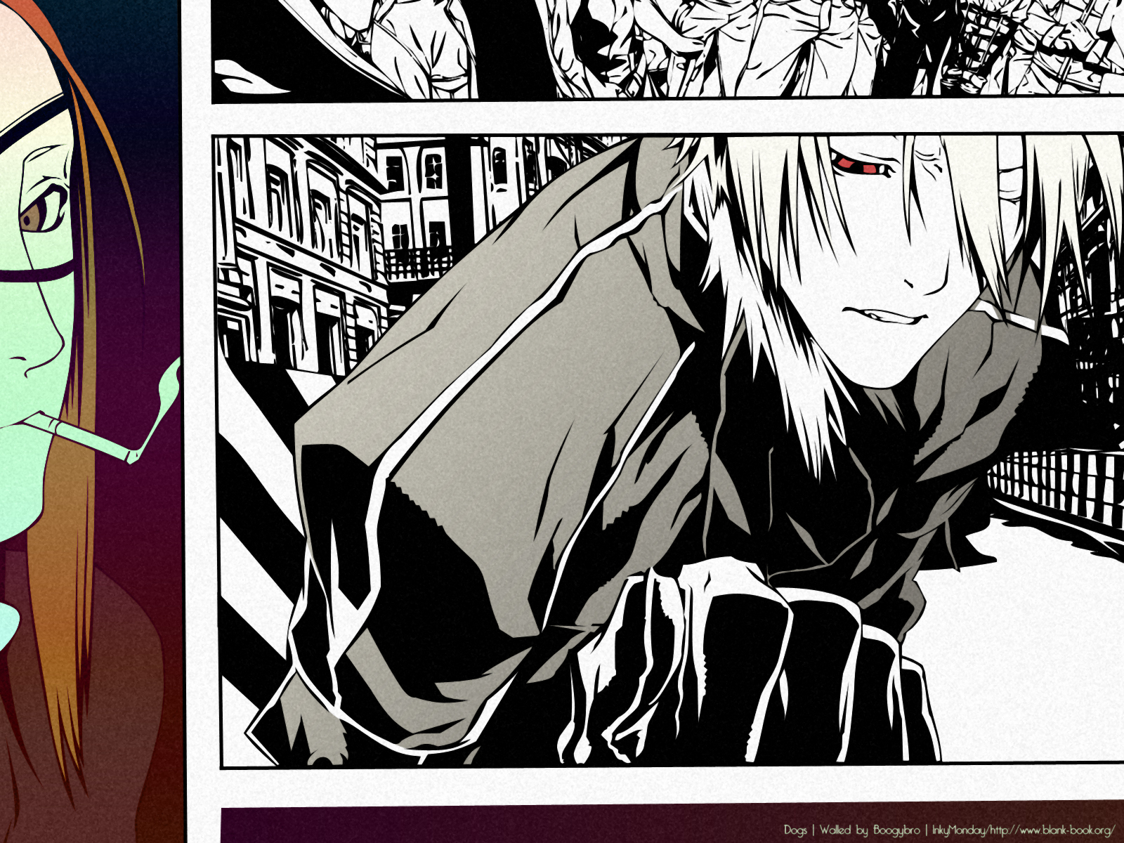 Description: A comic strip with a girl smoking a cigarette and a man in a suit with glasses looking at her.