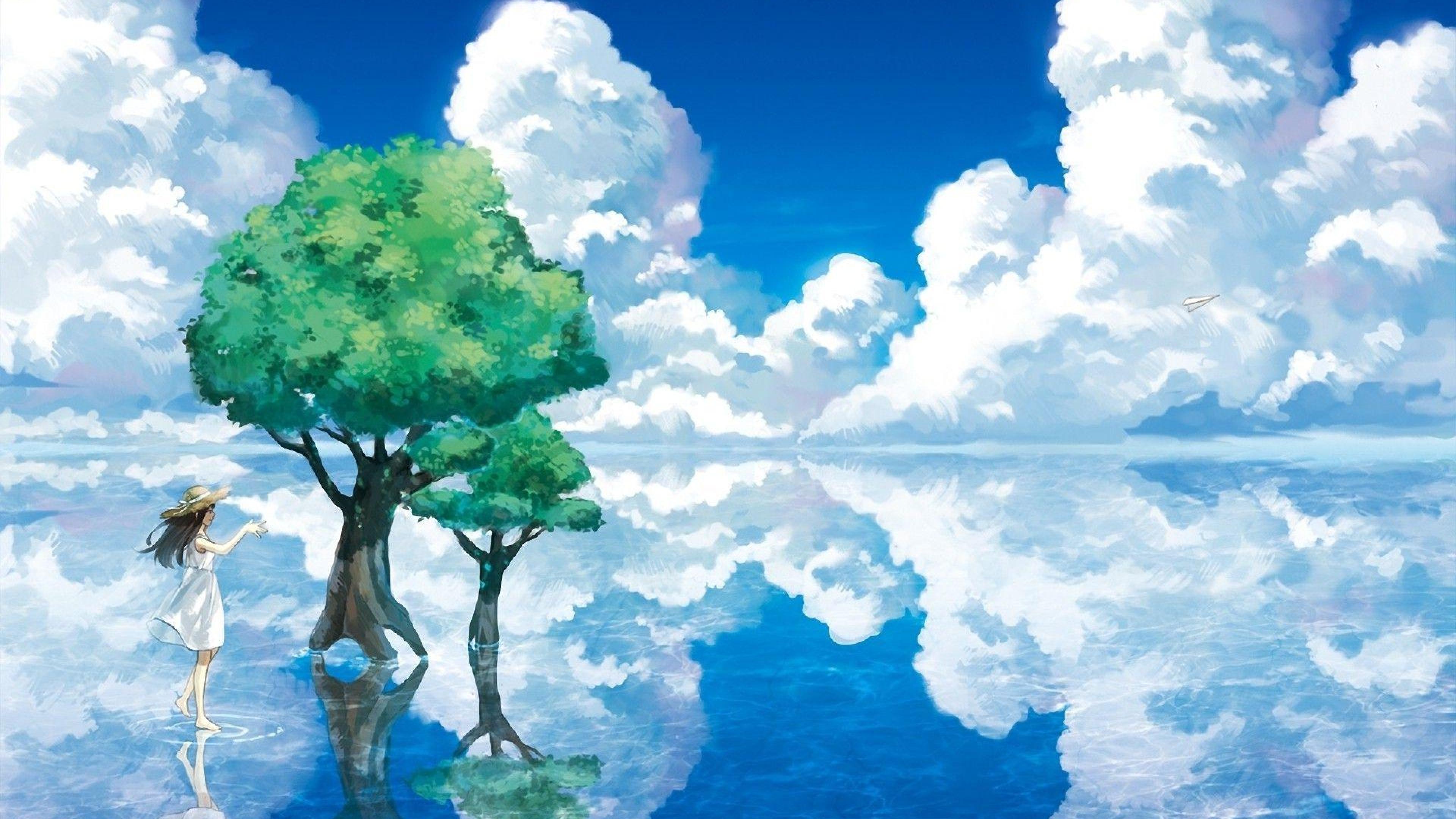 Description: A girl standing in the water next to a tree and clouds in the sky with a bird flying above.