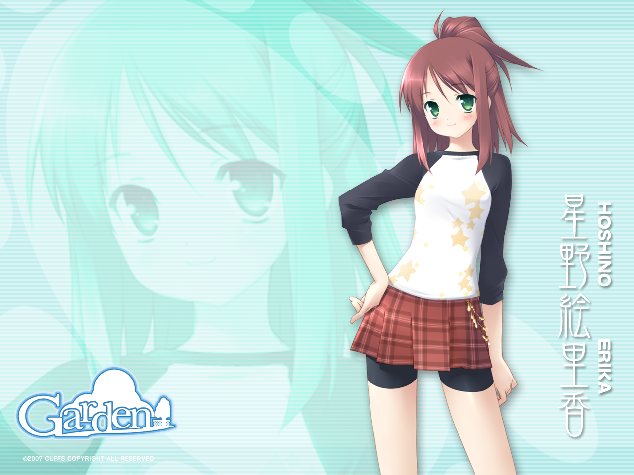 Description: A girl in a short skirt and a white shirt with a star on it.