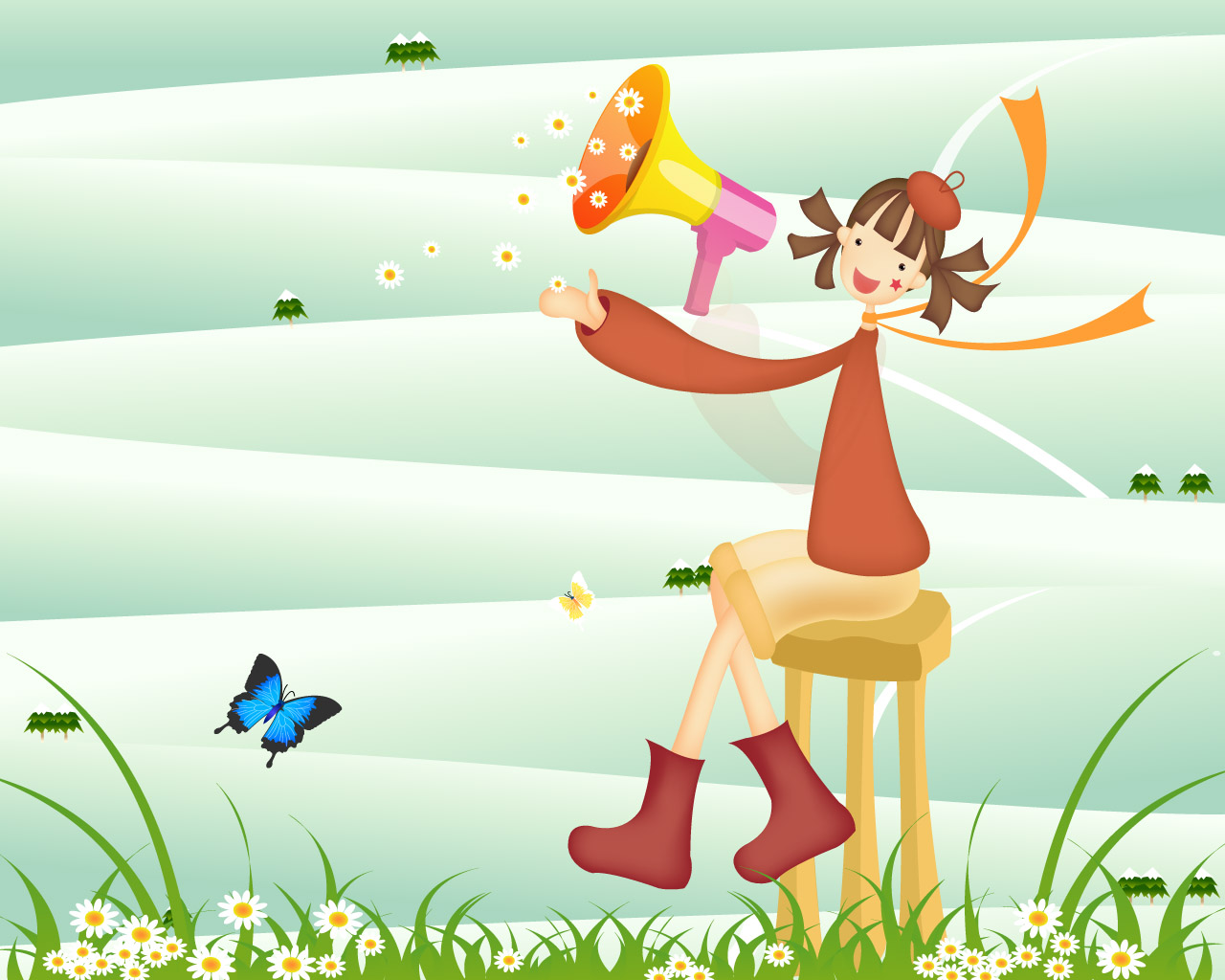 Description: A girl sitting on a stool with a megaphone in her hand and a butterfly flying around her.