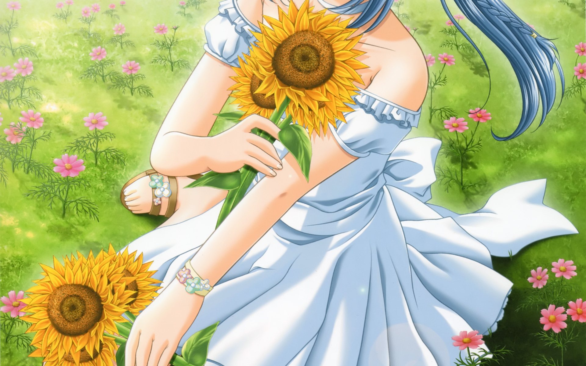 Description: A girl in a dress holding a sunflower in a field of flowers with a sky blue hair and a white dress.