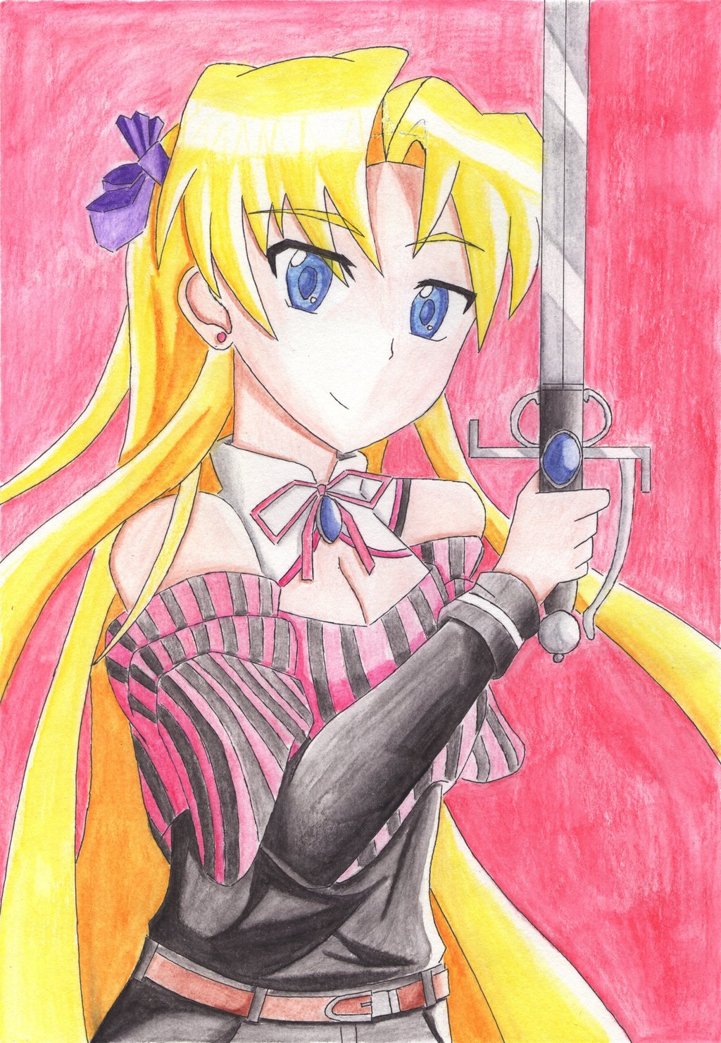 Description: A drawing of a girl holding a sword and a bow in her hand with a pink background and a pink background.
