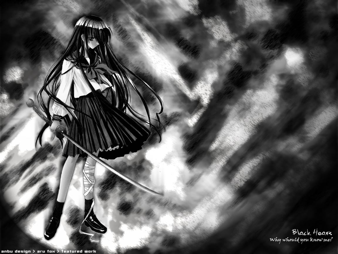 Description: A girl with a sword in her hand and a black and white background with clouds and clouds behind her.