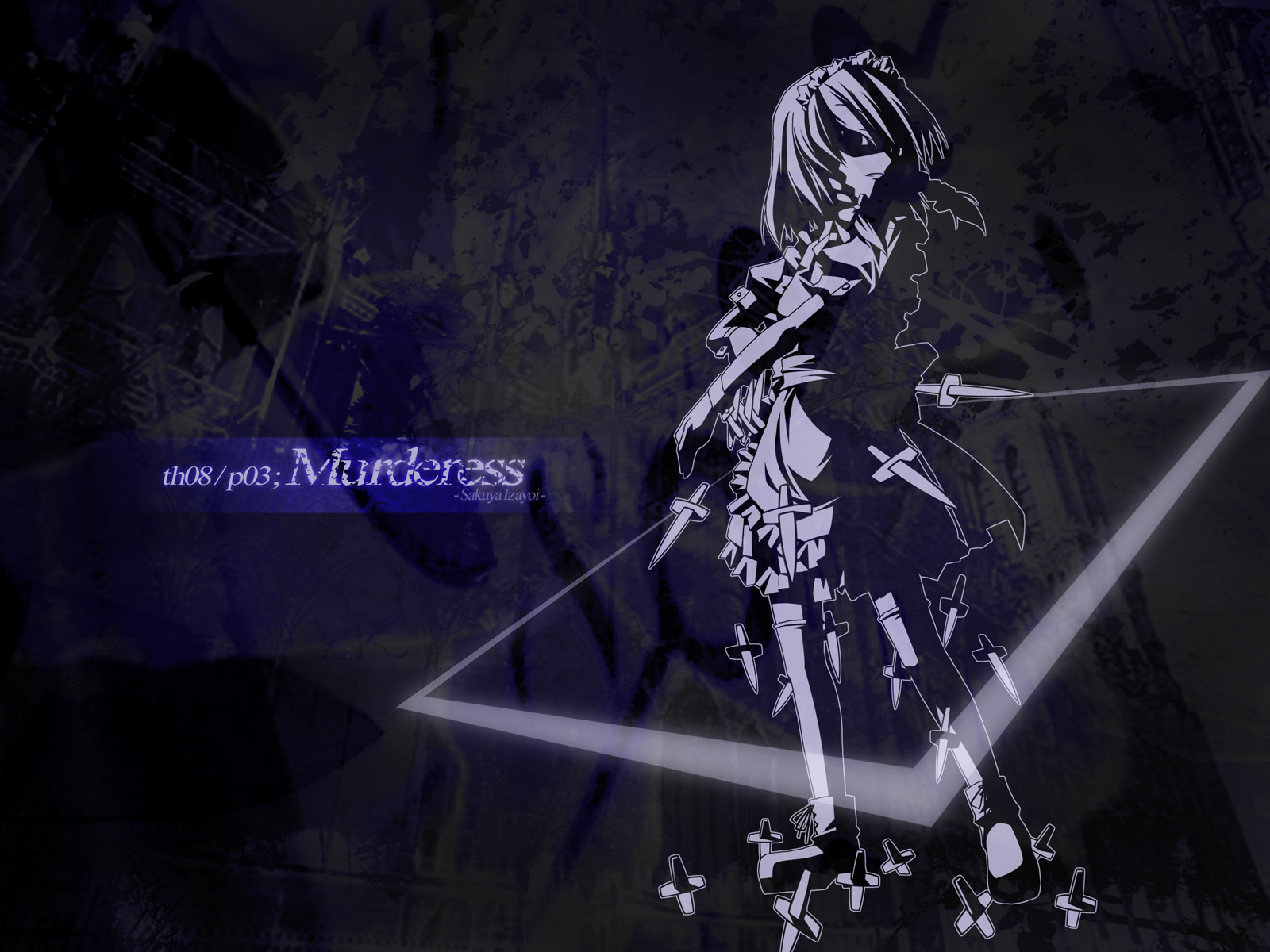 Description: A girl with a sword and a dress on a dark background with a blue light shining through her eyes.