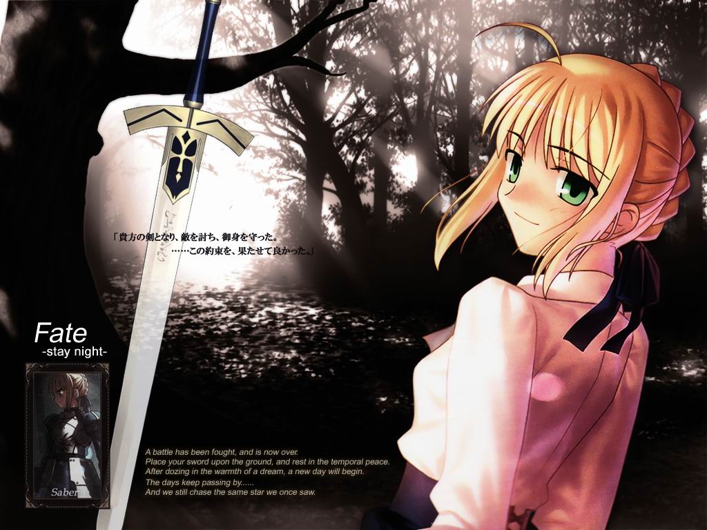 Description: A girl with a sword in a forest with trees in the background and a caption in the foreground.