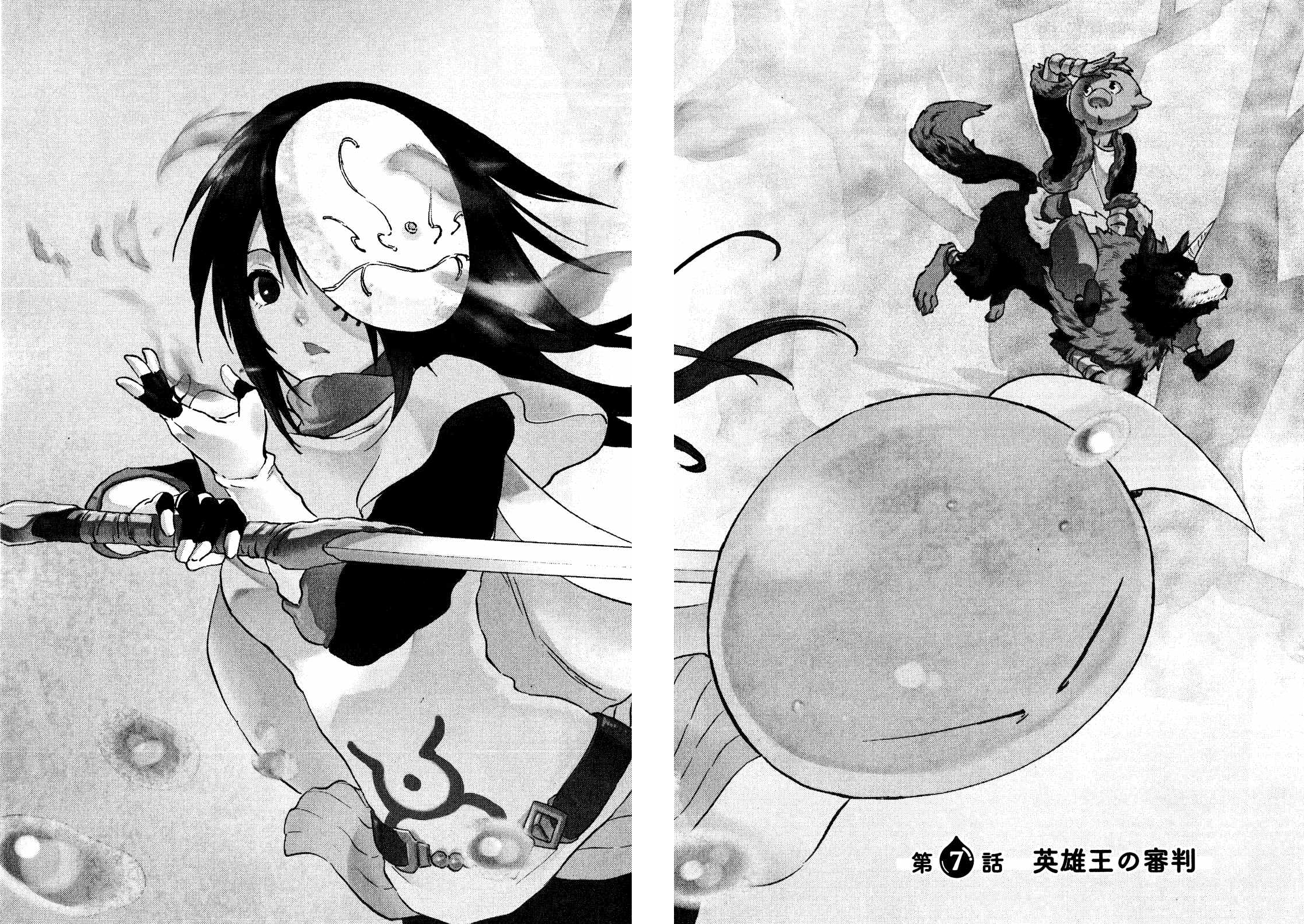 Description: A black and white image of a girl holding a sword and a man riding a horse behind her with a sword.