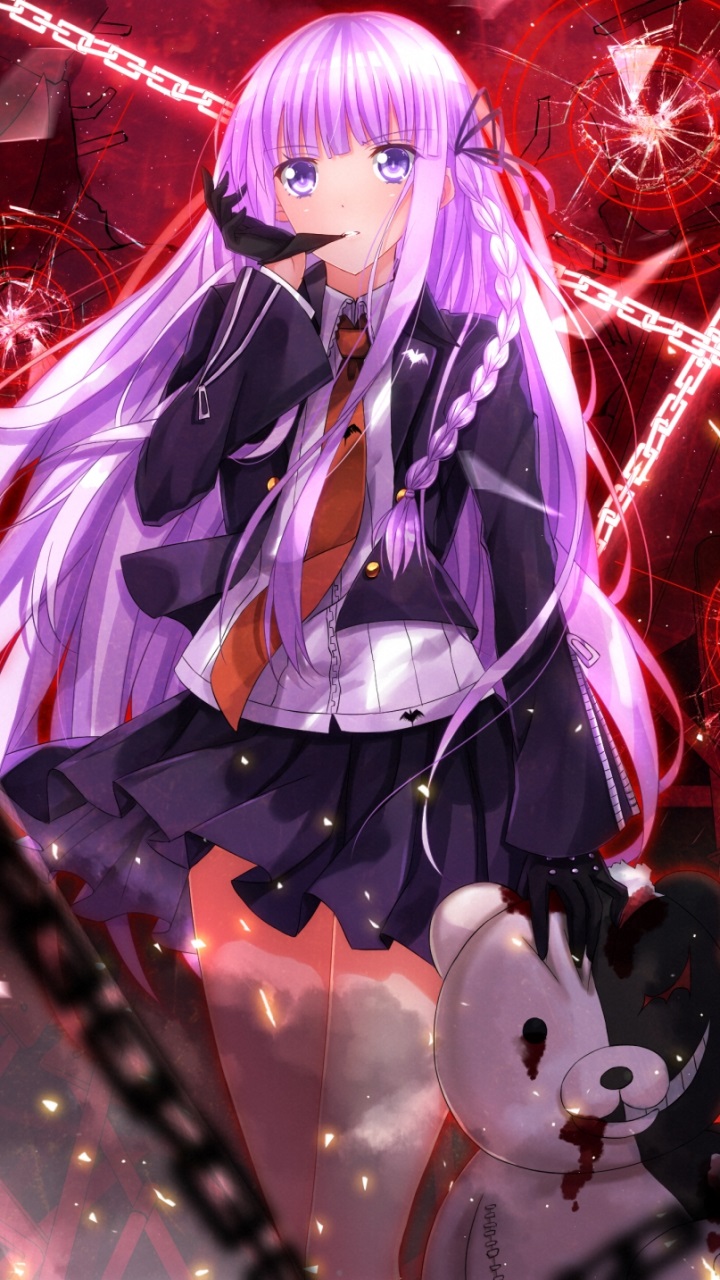 Description: A girl with long hair and a teddy bear in front of a red background with stars and lights and a red and white teddy bear.