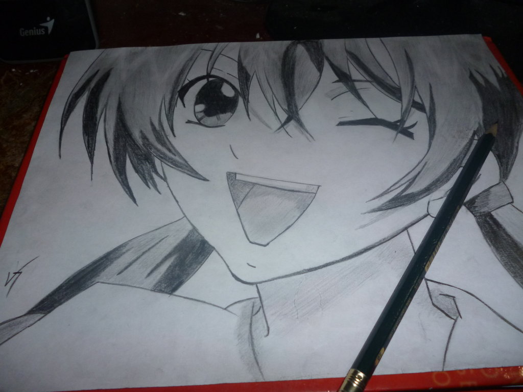 Description: A drawing of a girl with a tie on a piece of paper with a pencil in her hand and a pen in her other hand.