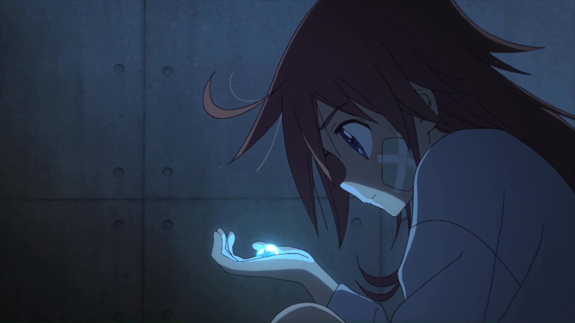 Description: A girl with a toothbrush in her mouth looking at something in her hand while staring at the camera.