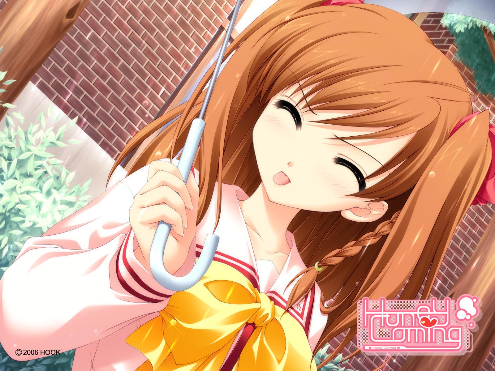 Description: A girl with long hair holding an umbrella in her hand and looking down at the ground with a brick wall behind her.