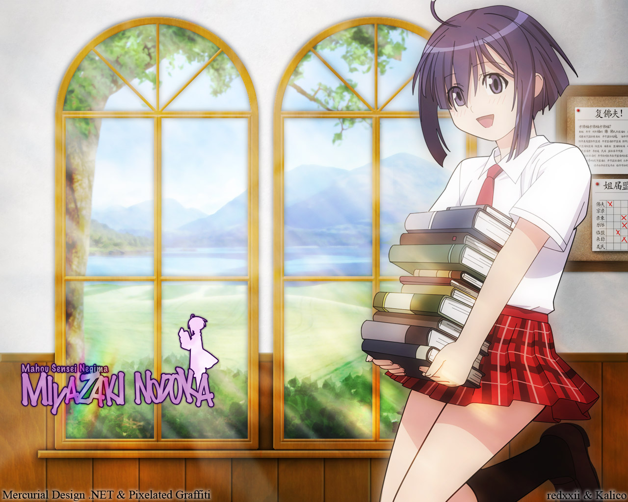 Description: A girl in a school uniform holding a stack of books in front of a window with a mountain view.