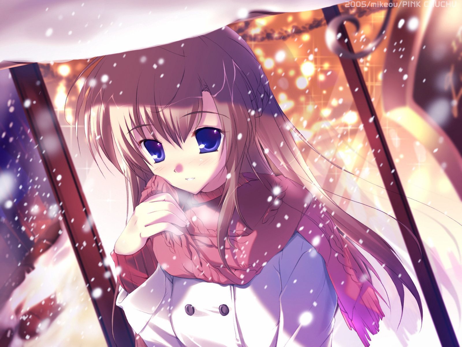 Description: A girl in a white coat and scarf in the snow with a umbrella in her hand and a snowflake behind her.