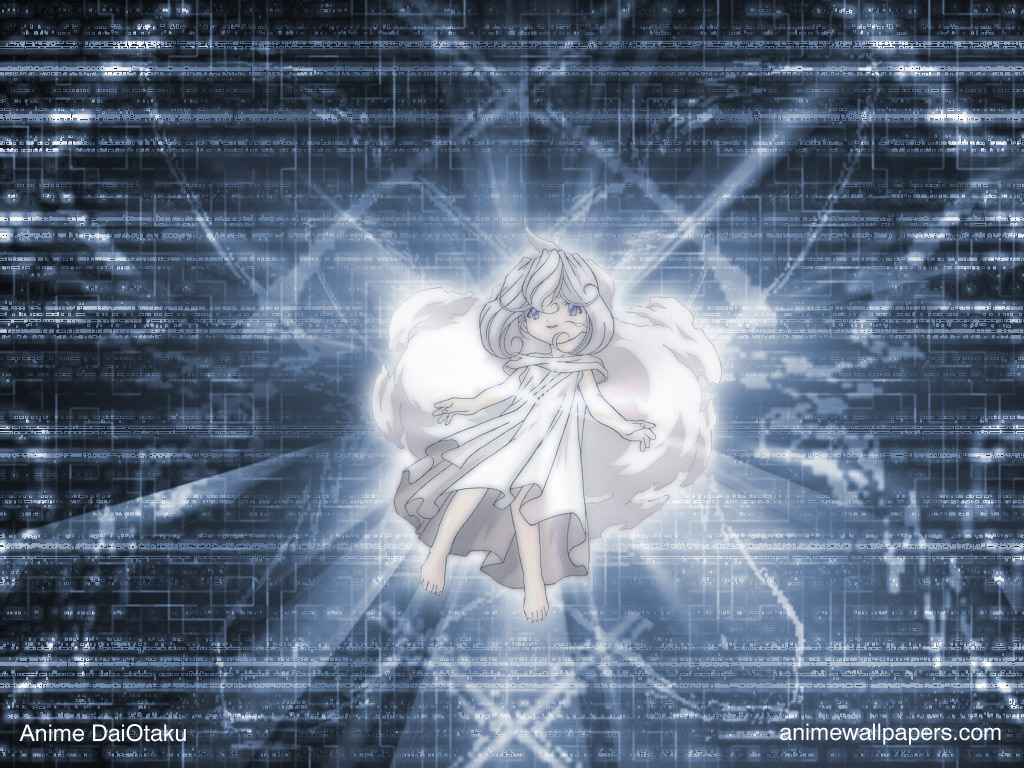 Description: A girl with a white dress and angel wings in a blue background with lines and lines around her and a blue background with lines and lines.