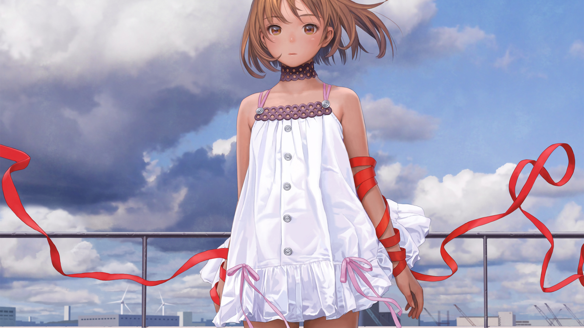 Description: A girl in a white dress standing on a balcony with a red ribbon around her neck and a sky background.