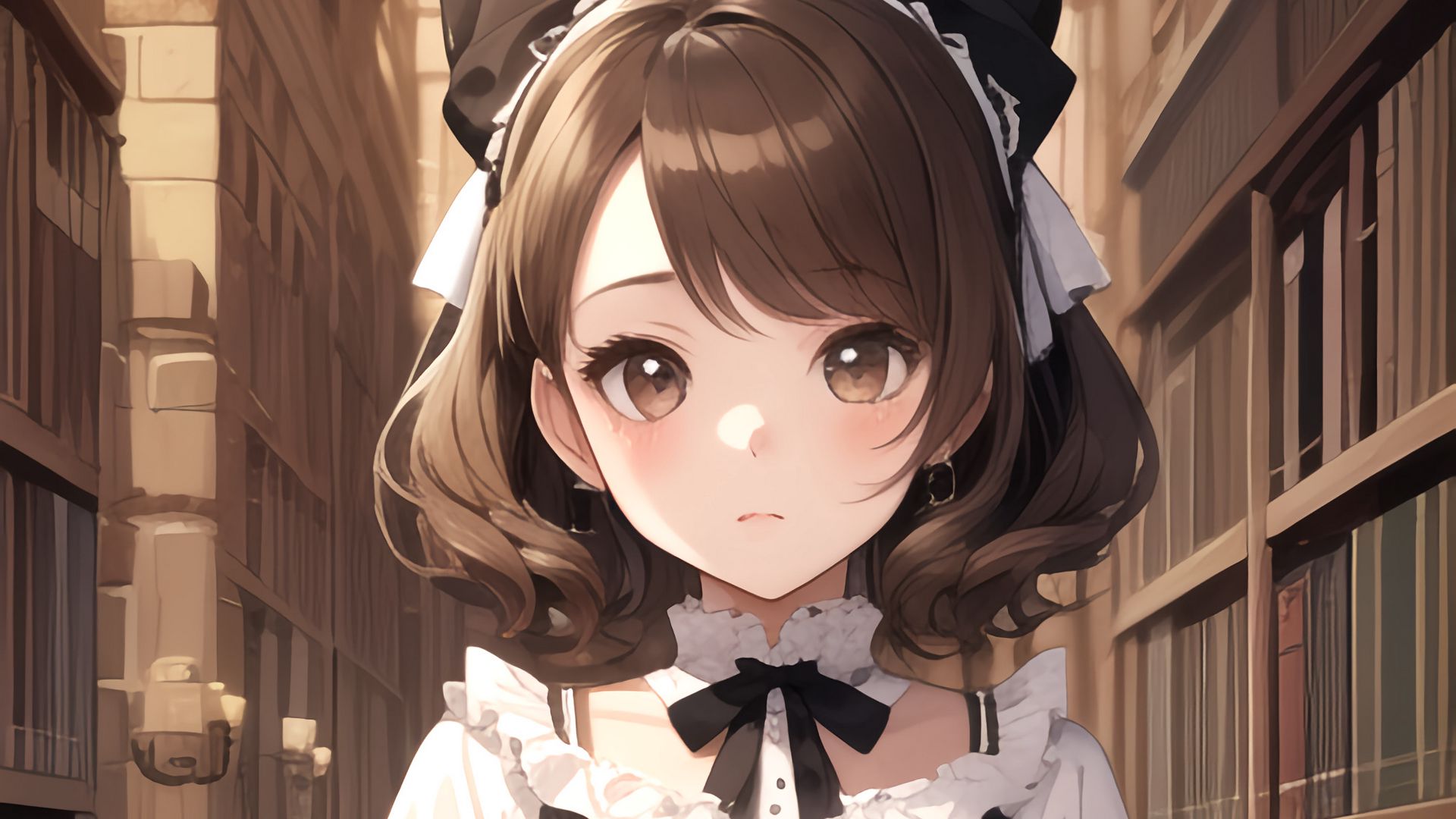 Description: A girl in a white dress and black bow tie standing in a narrow alleyway in a city with tall buildings.