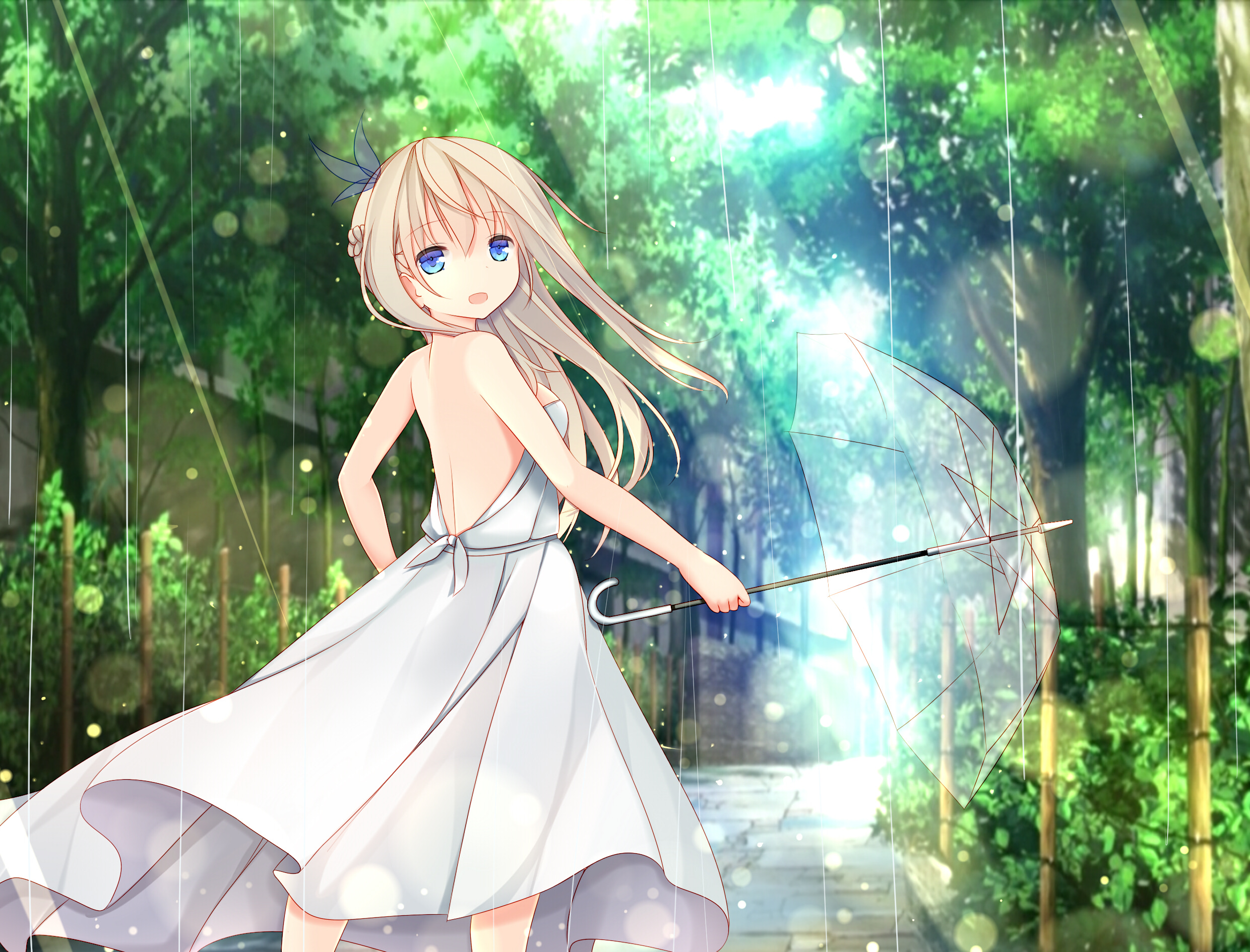 Description: A girl in a white dress holding an umbrella in the rain with trees in the background and a path leading to the right.