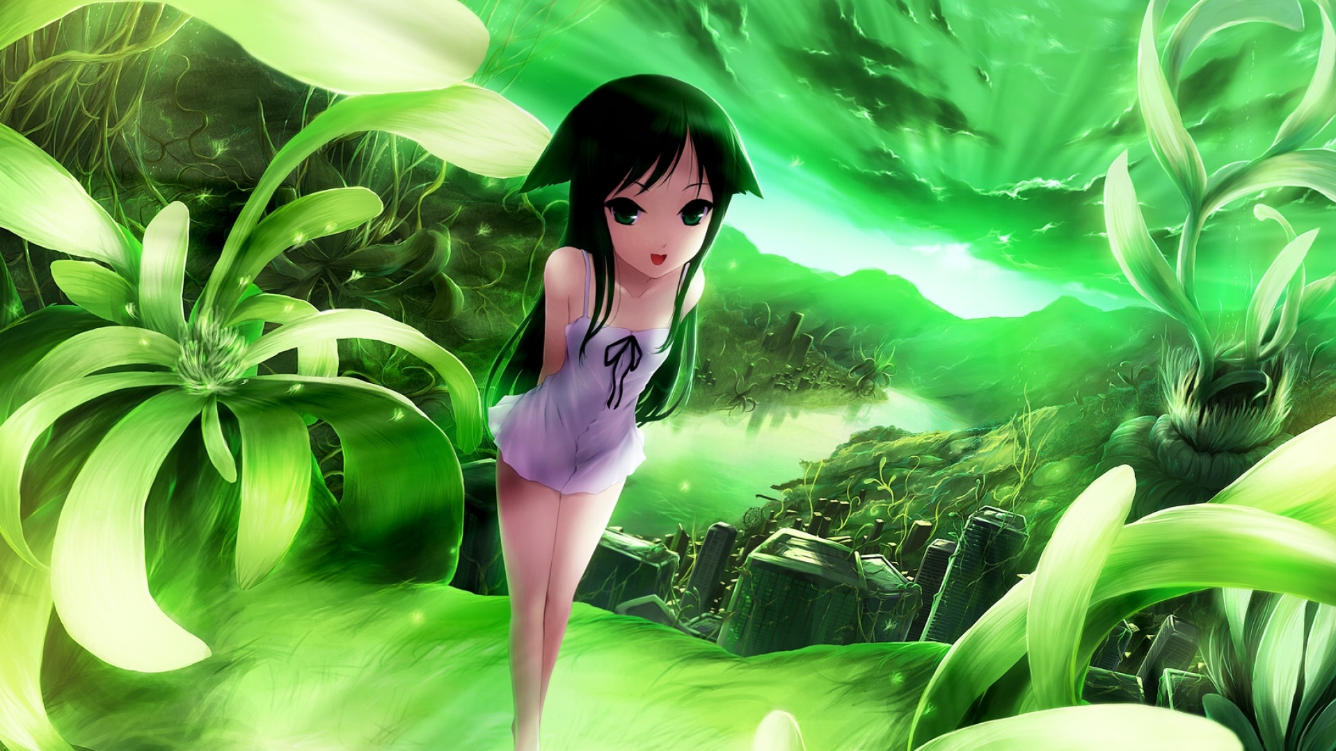 Description: A girl in a white dress is walking through a green forest with a green plant in the foreground.