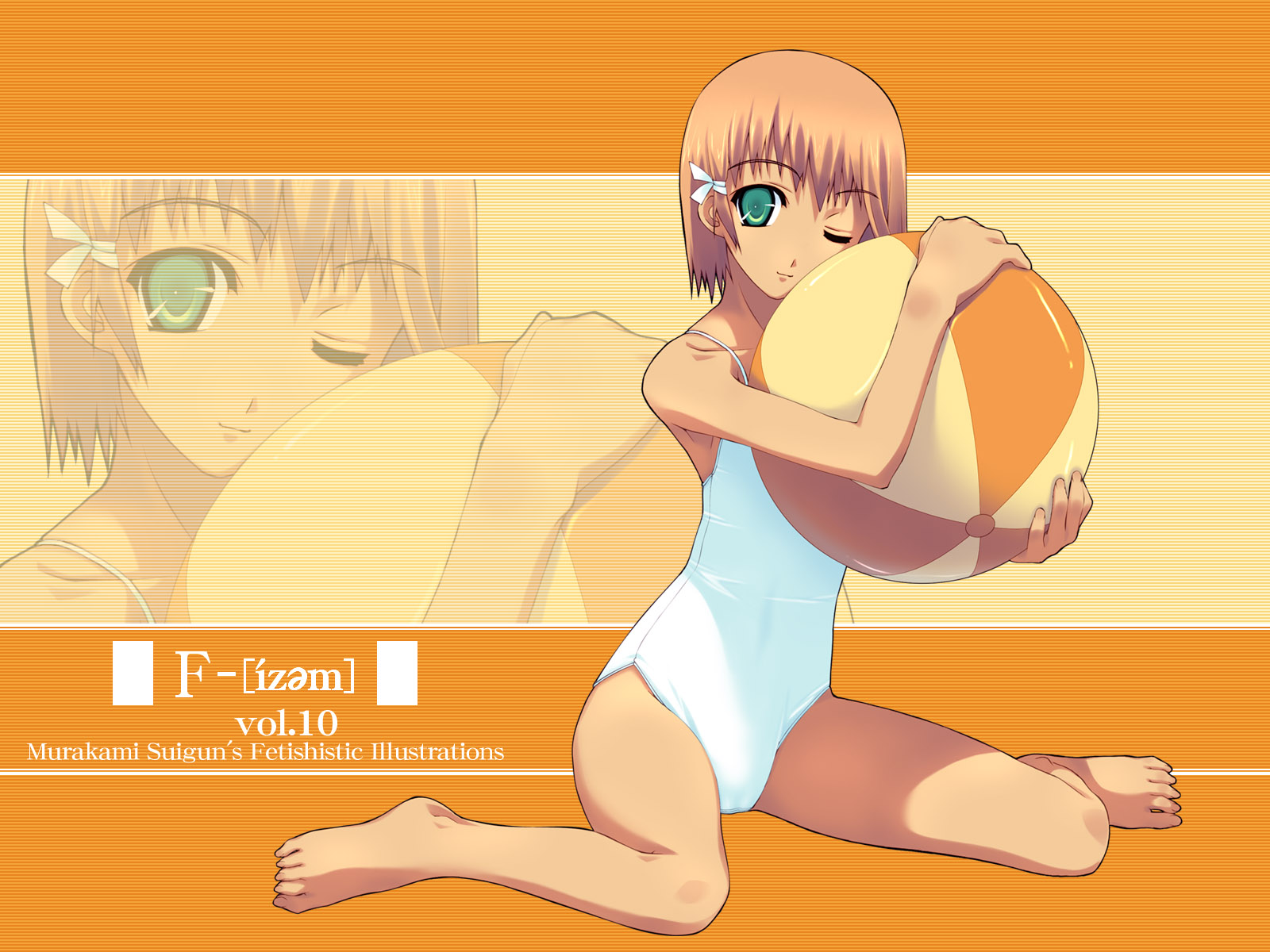 Description: A girl in a white swimsuit holding a ball in her hand and a yellow background with a white border.
