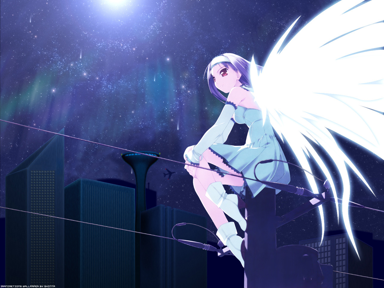 Description: A girl with white wings sitting on a wire in the night sky with a cityscape in the background.